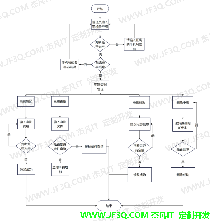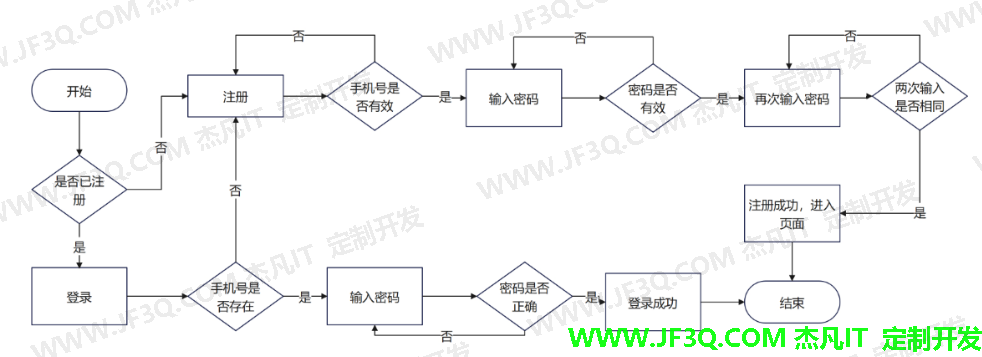 图2 功能图(管理员) 4.1 登录注册模块 4.1.1 登录注册 用户进入网站,新用户点击注册,注册完成后会自动跳转登录。已注册用户使用手机号密码进行登录。具体流程图如图3所示。