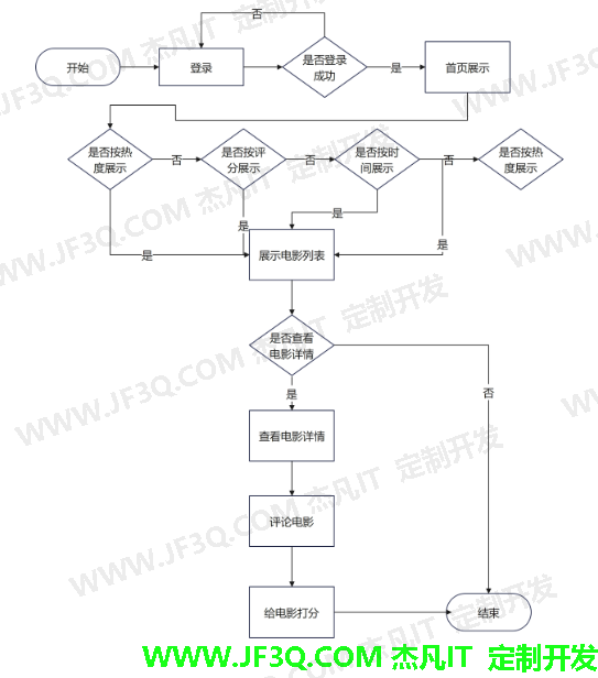 图4 忘记密码流程图 4.2 首页展示模块 4.2.1 首页展示 用户登录成功进入网站后,首先会看到电影列表展示,可以通过选择按热度、评分、类型、时间进行电影展示,在此页面中,用户可以点击对应的电影进入电影详情页,并给电影进行评价和评分。流程如图5。