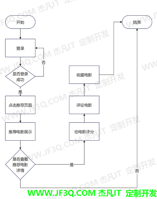 图5 首页展示流程图 4.3 推荐页面模块 4.3.1 推荐页面 该页面基于协同过滤算法,系统会根据用户在注册时所选择的电影类型,以及用户以往的观影记录,以及用户的兴趣爱好,来推荐该用户可能喜欢的电影。流程图如图6。