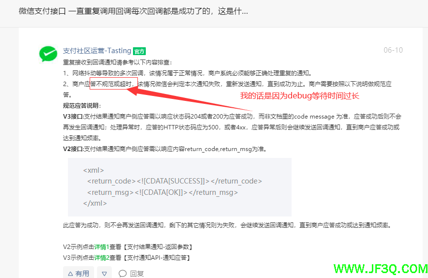 已经告诉微信这边进回调了,但微信还是一直发请求过来,原因是给微信返回的必须是xml格式的数据,而且还必须加签加密后再传。