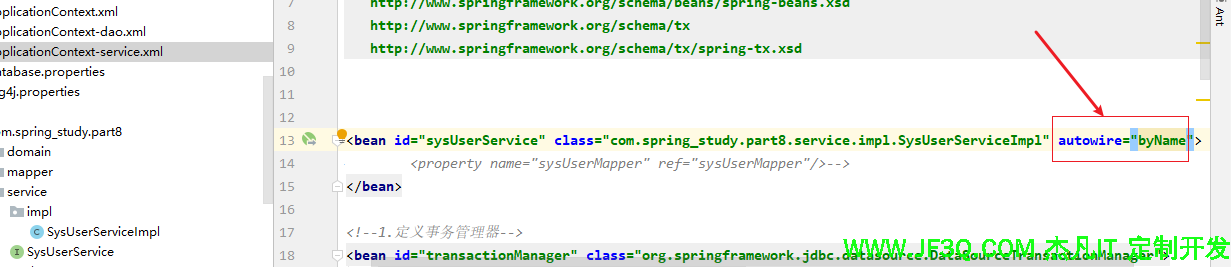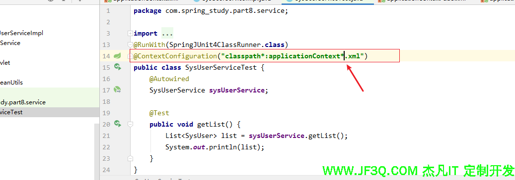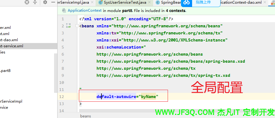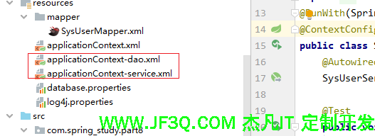 @ContextConfiguration({"classpath:applicationContext-dao.xml","classpath:applicationContext-service.xml"})3.bean的自动装配