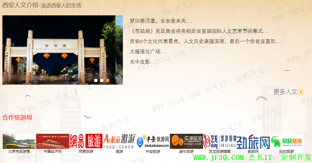 (1)主界模块设计:首页效果、首页西安人文、首页酒店信息、首页景点信息、自驾游路线。在线留言、用户注册、首页后台登录。