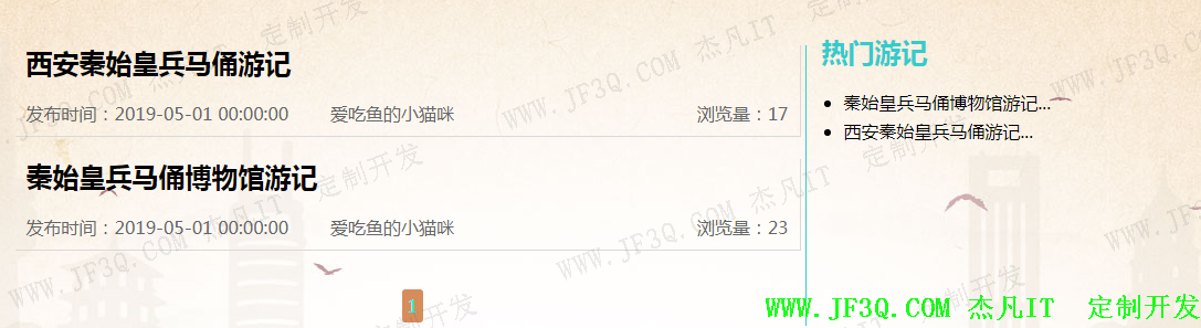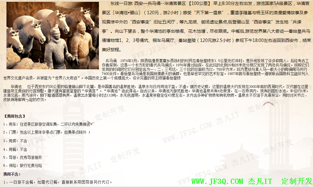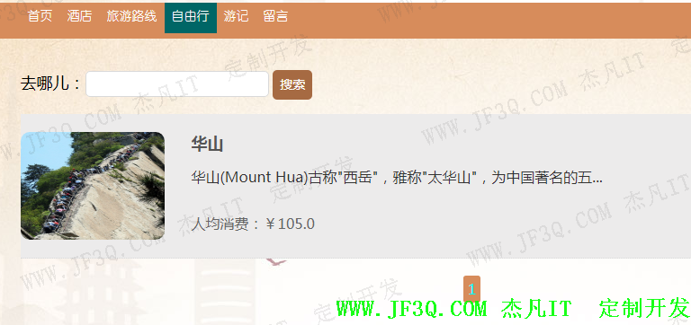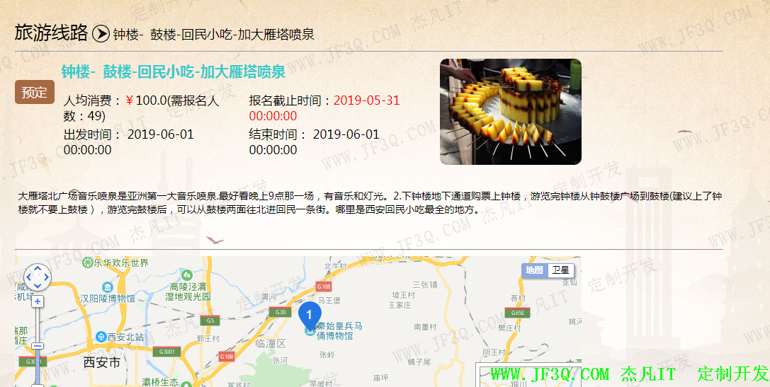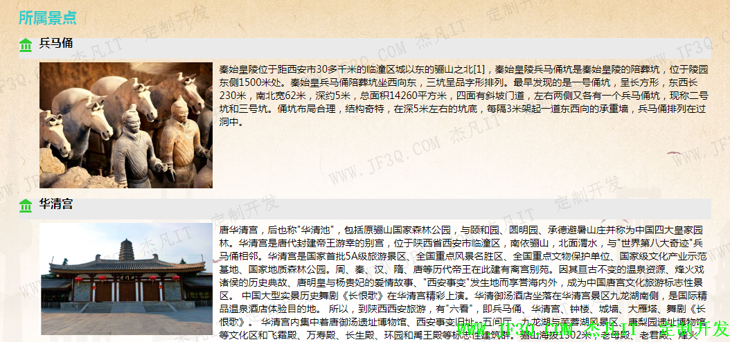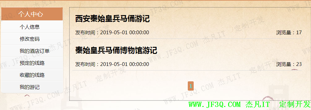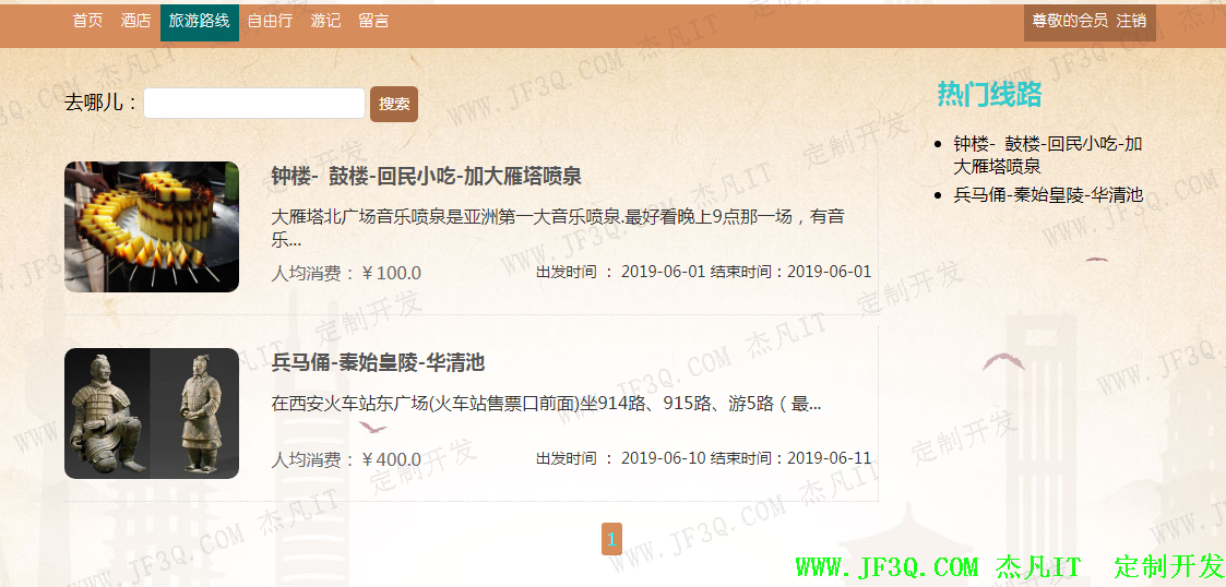 (1)网站前台的设计与实现:主要是对数据的展示和查询,包括景点展示、景区图片浏览、酒店展示、路线规划、自由行、西安人文介绍、用户游记查看、留言等。