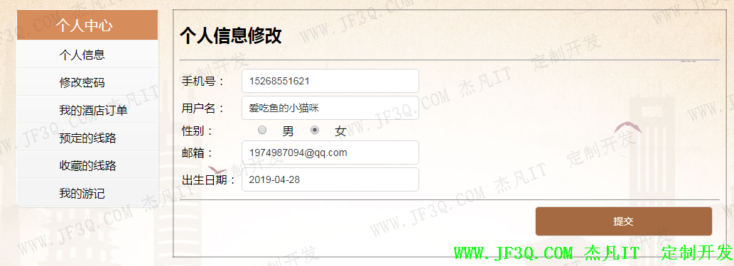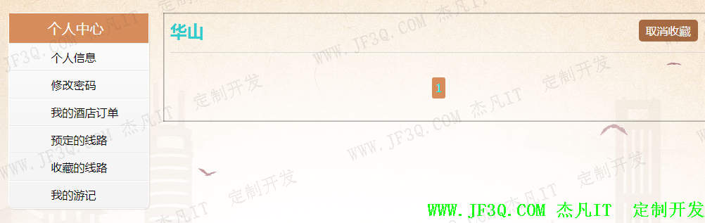 个人中心主要是针对普通用户的后台数据管理,包含登录、注册、个人基本信息编辑、密码修改、酒店预订和入住情况、预定路线、收藏、发表游记等功能。