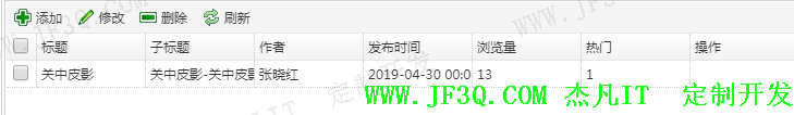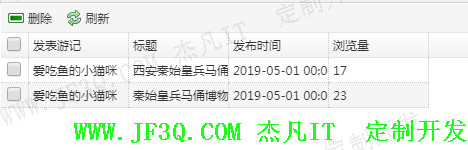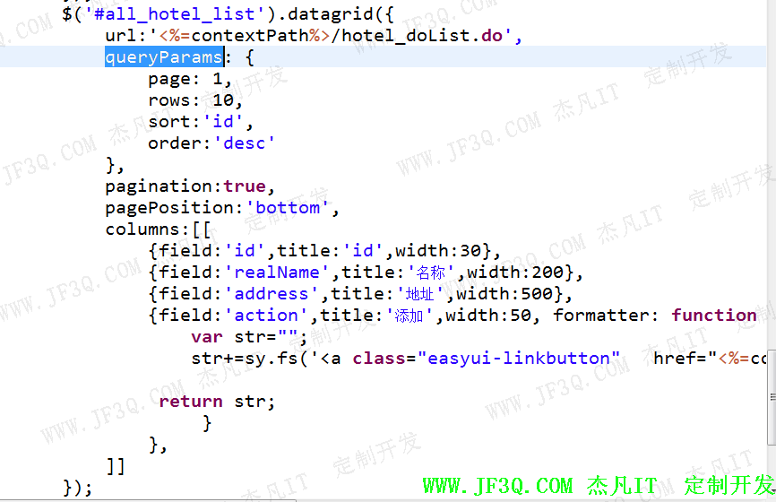 管理员后台使用jquery ui框架实现,jQuery UI 是以 jQuery 为基础的开源 JavaScript 网页用户界面代码库。包含底层用户交互、动画、特效和可更换主题的可视控件。可以直接用它来构建具有很好交互性的web应用程序。此项目中主要用到了datagrid表格控件,它其实是使用了ajax来实现数据的获取,根据他的需要传入固定参数,比如:URL请求路径、queryParams查询参数。然后将返回的字段绑定到对应的表格的列,还可以进行分页功能,既方便使用,又可以开发快速。如下图所示: