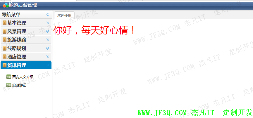 管理员后台主要包括基本管理、风景管理、旅游路线、路线规划、酒店管理、资讯管理。管理员通过该后台对网站的信息展示和用户进行管理,实现网站与线下旅游相结合,方便用户规划自己的旅游假期和酒店预订。