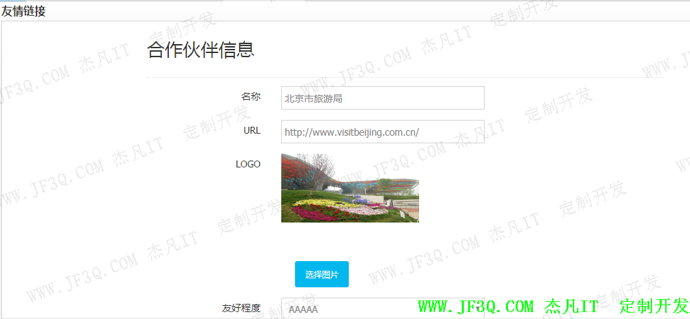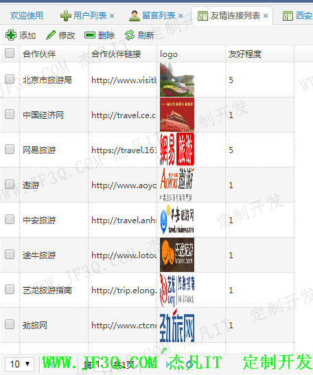 友情连接列表就是针对合作的其他旅游公司或者机构进行一个外联的引流和宣传,起到对方相互引流的合作。包括添加、编辑、删除、上传logo的功能。在首页的下方展示。