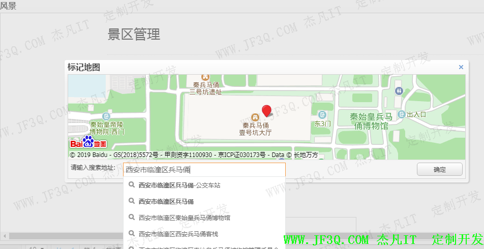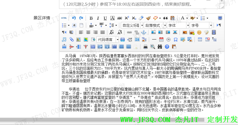 风景管理主要包括对旅游套餐的添加、编辑,删除,还包括景点附近的酒店信息的添加,编辑和删除。其中采用了第三方百度地图API来实现对景区地址的标记。百度的超文本编辑器插件来实现对景区的详细介绍,可以同时输入文字、图片、段落、表格等各种复杂的文字格式,这样既方便又灵活,可以更加清楚地展示对景区的详细说明。