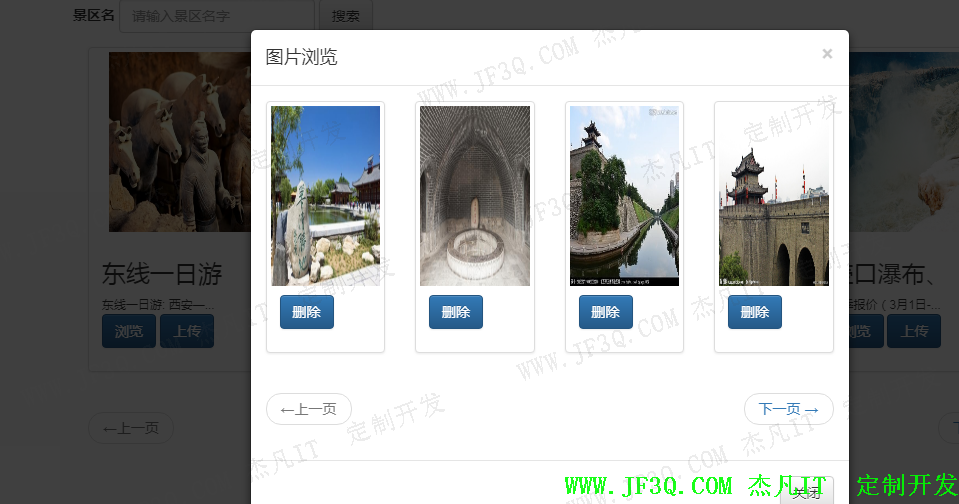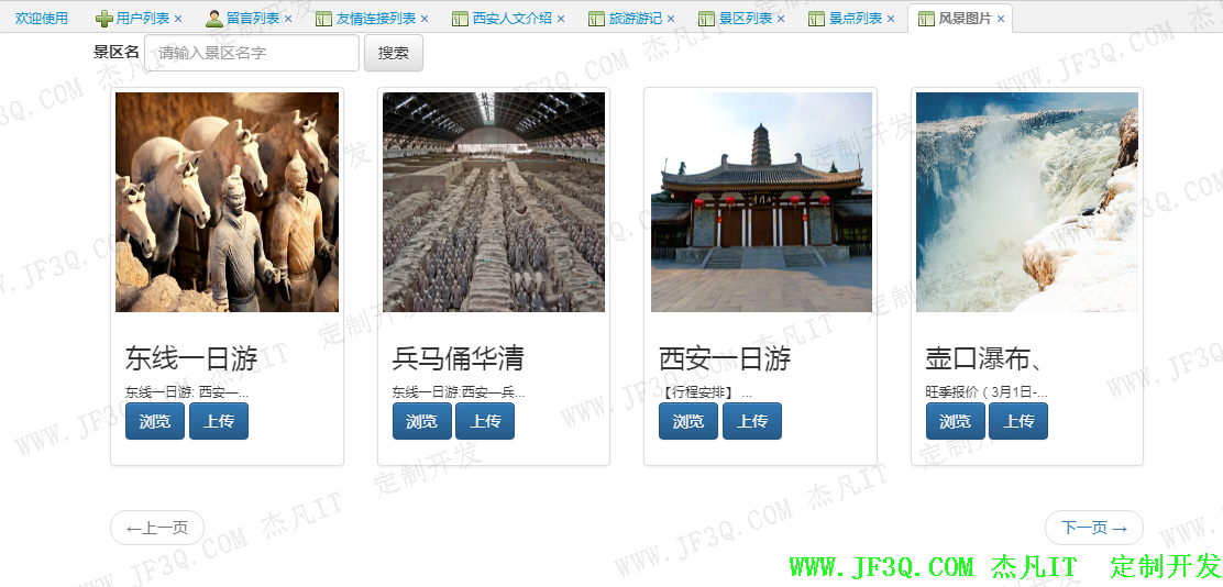 风景图片就是对景区和景点的图片进行管理,因为用户在报名之前,大多数都是通过浏览网站景区的图片来进行赛选和参考的。所以,需要将景区图片功能独立出来进行管理。