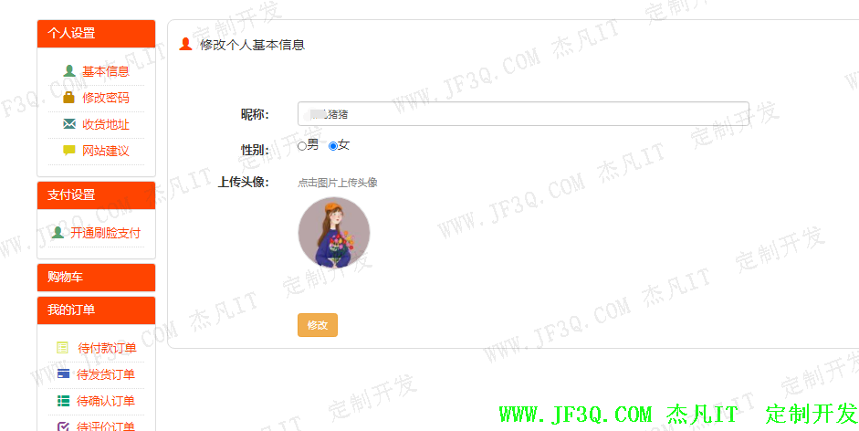编辑个人资料 public String saveuinfo(HttpServletRequest request, HttpServletResponse response, HttpSession session, Model model, SpUsers u) | Nickname昵称,sex性别,faceing头像 |