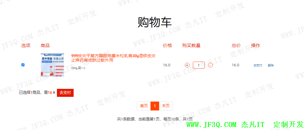 购物车是前端功能的核心之一,他会把用户选择有意向的药品加入其中,最后用户选择药品支付,用户可以修改数量,删除,单个支付,或者选择性的支付。如图: