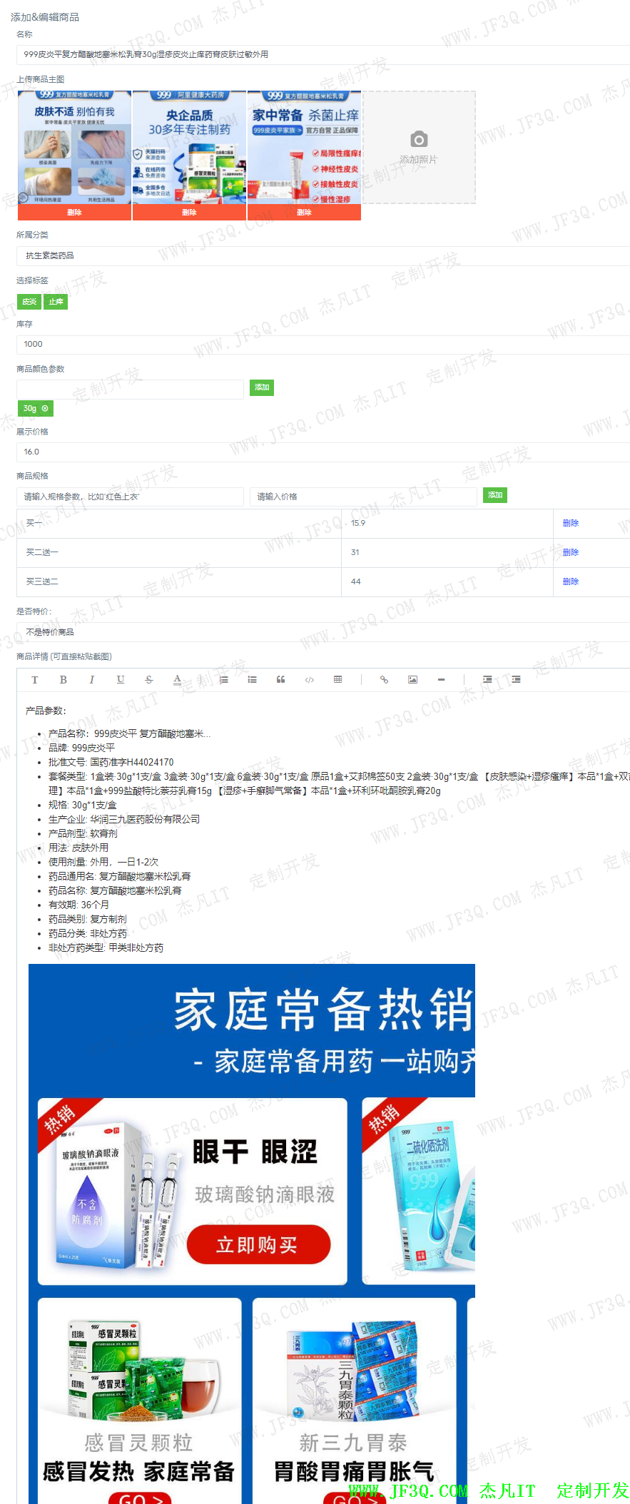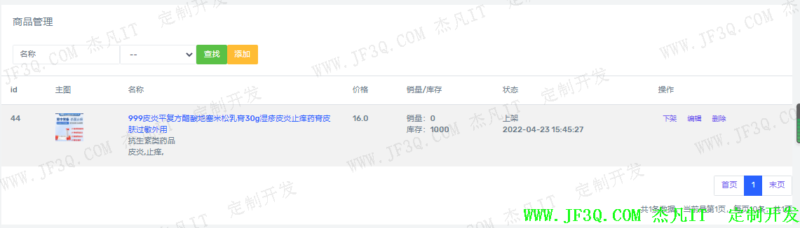 管理员可以进行搜索、编辑、添加、分页以及删除数据。当管理员在添加或者编辑商品时可以裁剪图片,添加不同规格和对应的不同价格,还可以上架下架该商品, 使用simditor-1.0.5富文本编译器进行药品内容的编写