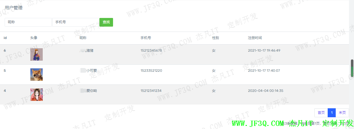 管理员可以查看和搜索注册的用户信息,主要使用AdminSpUsersController实现,方法如下:
