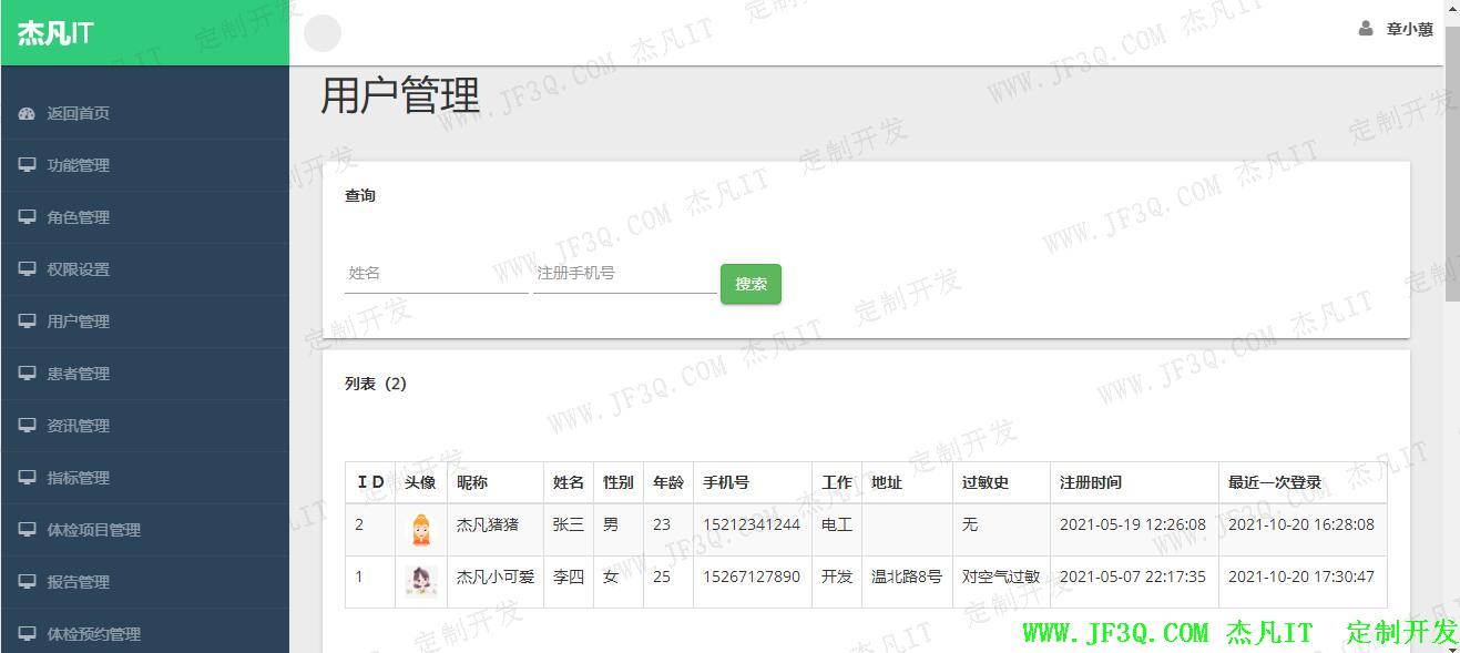 用户登陆系统后可以完成查看健康信息资讯功能,医生专家管理功能,医生专家管理功能,健康检查管理功能,预约管理功能,检查报告管理功能,健康服务管理功能,系统管理功能。