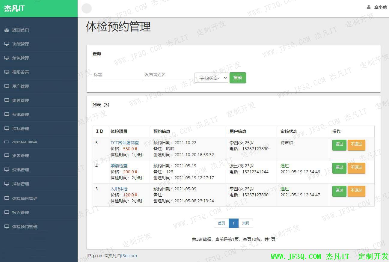 8 | 预约审批 | 医生根据用户所预约的体检进行审批 | 用户所预约的体检 | 审批通过 |