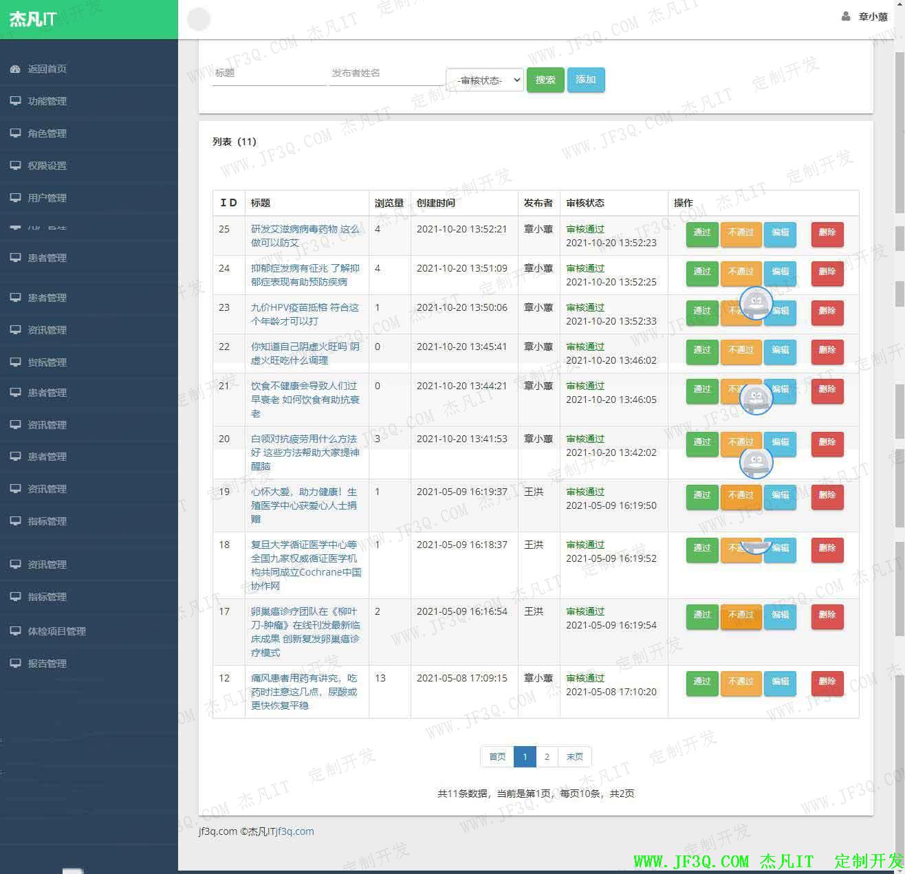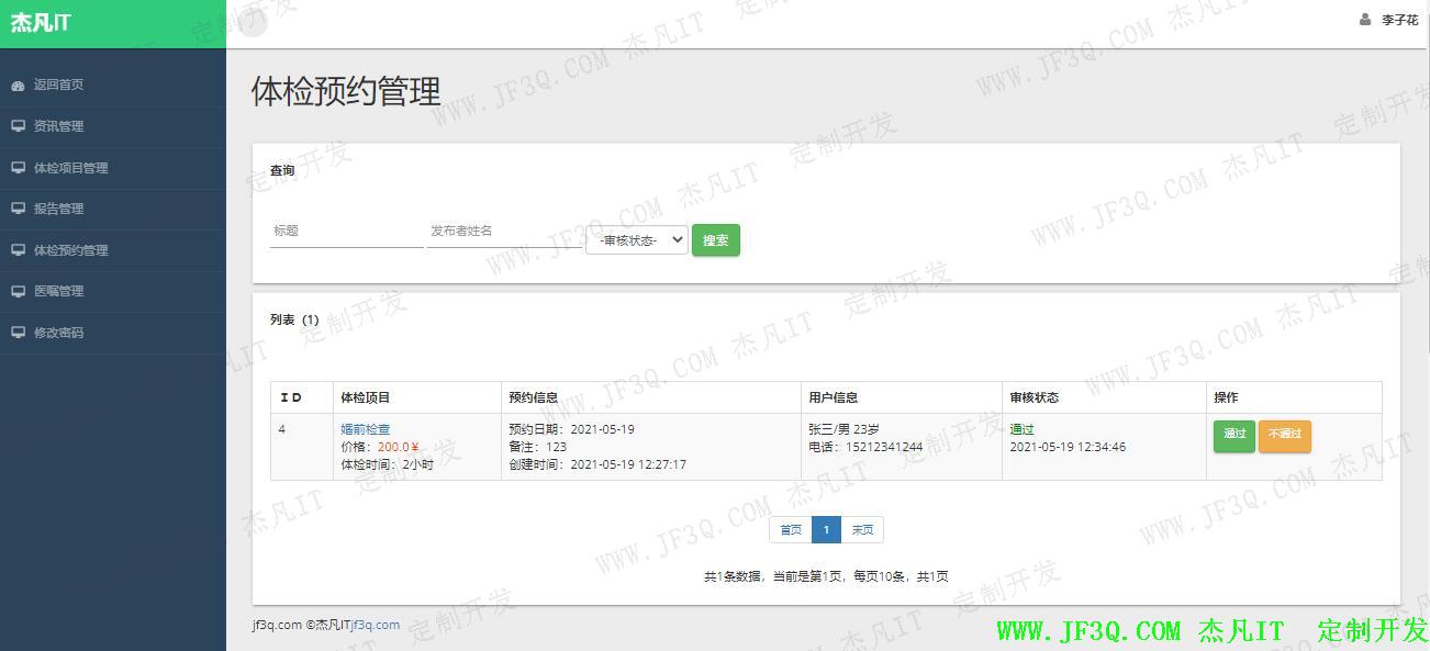 管理员通过登陆后进入系统,可以管理健康信息资讯功能,对医生专家进行管理功能,健康检查管理功能,预约管理功能,检查报告管理功能,健康服务管理功能,系统管理功能。