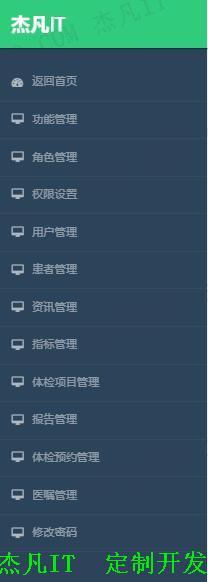 医生登陆系统后可以完成健康信息指南功能,健康检查管理功能,预约管理功能,检查报告管理功能,健康服务管理功能,系统管理功能。