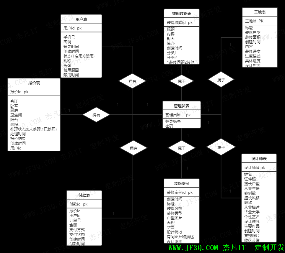 绿局装修网站系统数据库的 E-R 图设计是对网站数据中的各个数据表的实体关系进行描述。E 代表实体,R 代表关系,即实体-关系图。基于 MySQL的绿局装修公司网站数据库 E-R 图设计,如图 4-2数据库E-R图。