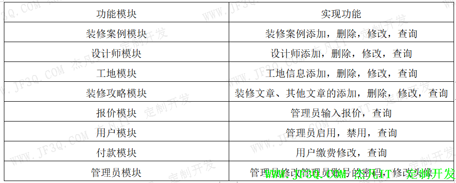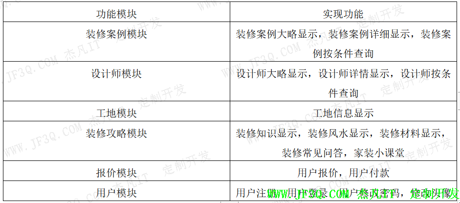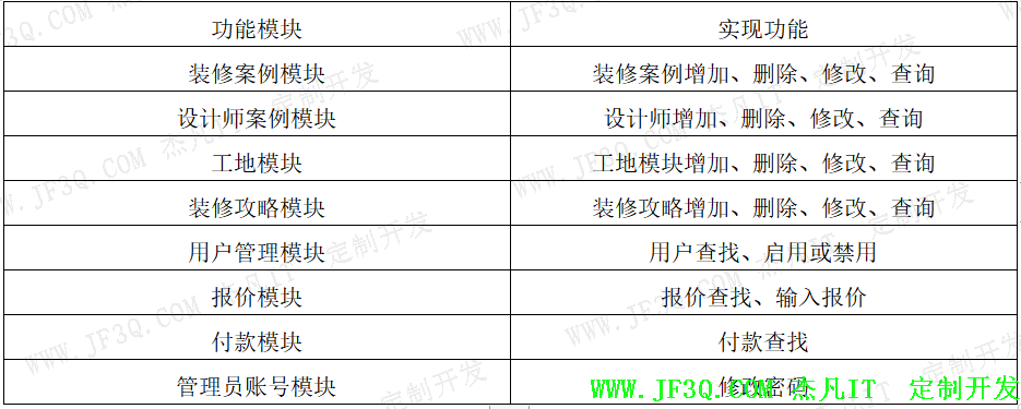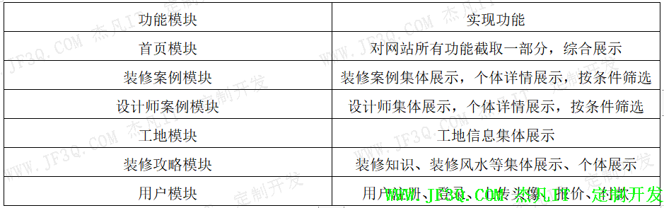 本文经过对绿局装修网站系统的需求分析,将整个系统分为两部分,前台展示系统和后台管理系统。前台系统主要是为访问者提供浏览界面,后台系统是管理员管理和维护本网站的界面。因此,针对该公司网站的需求进行解析,设计的这个网站,定义了以下功能。详情见表3-1绿居装修网站前台功能需求分析,表3-2绿居装修网站后台功能需求分析。