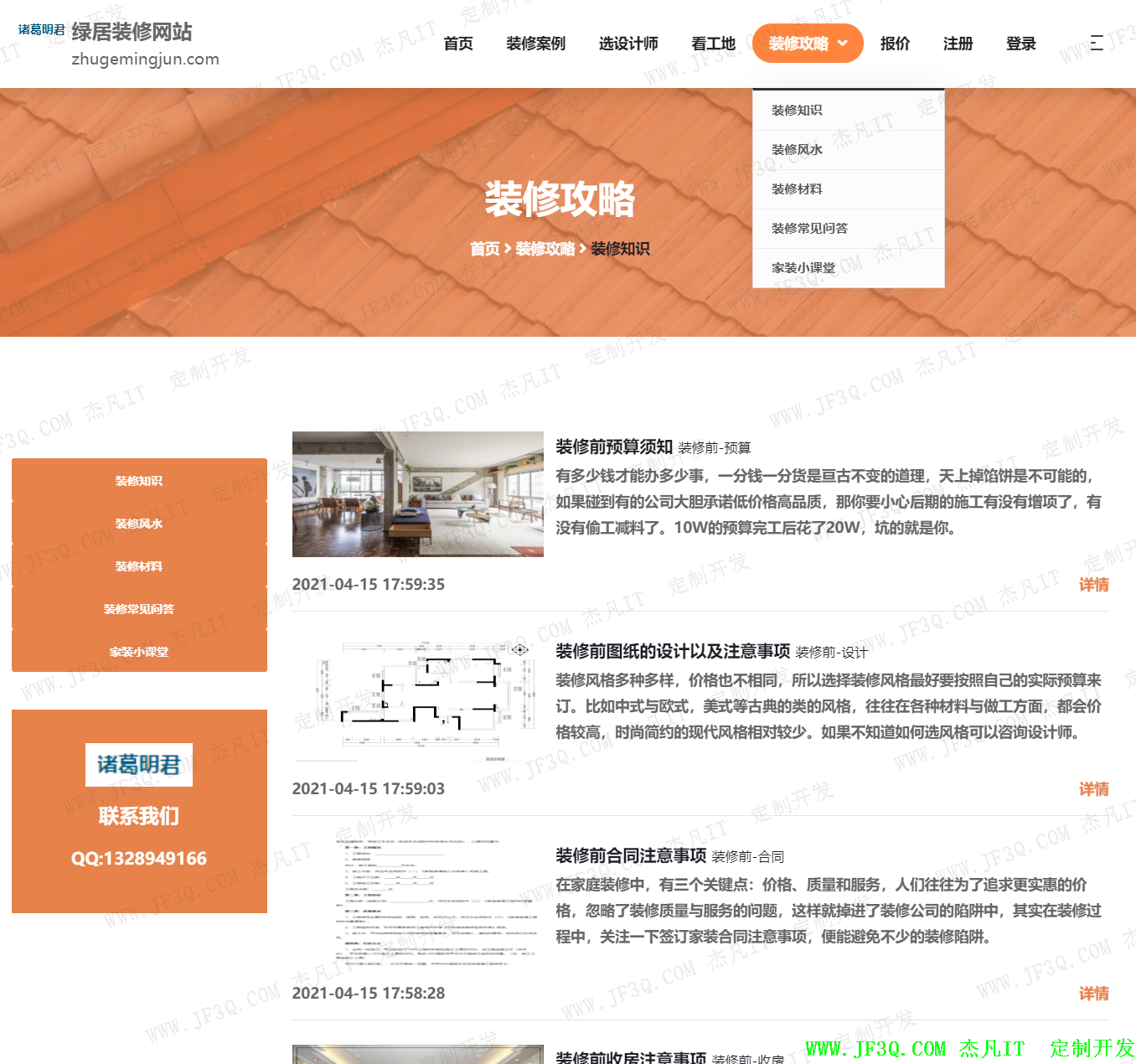 通过点击首页的装修攻略导航栏下拉框,显示如下下拉选项供用户选择,分别是装修知识、装修风水、装修材料、装修常见问答、家装小课堂,用户可以根据自己的需求点击进入,装修攻略内容分为详略显示和详情显示。如图5-5装修攻略详略,如图5-6装修攻略详情。