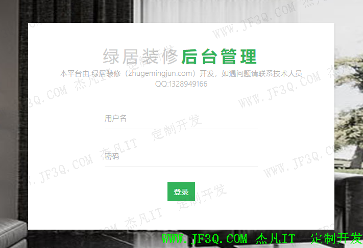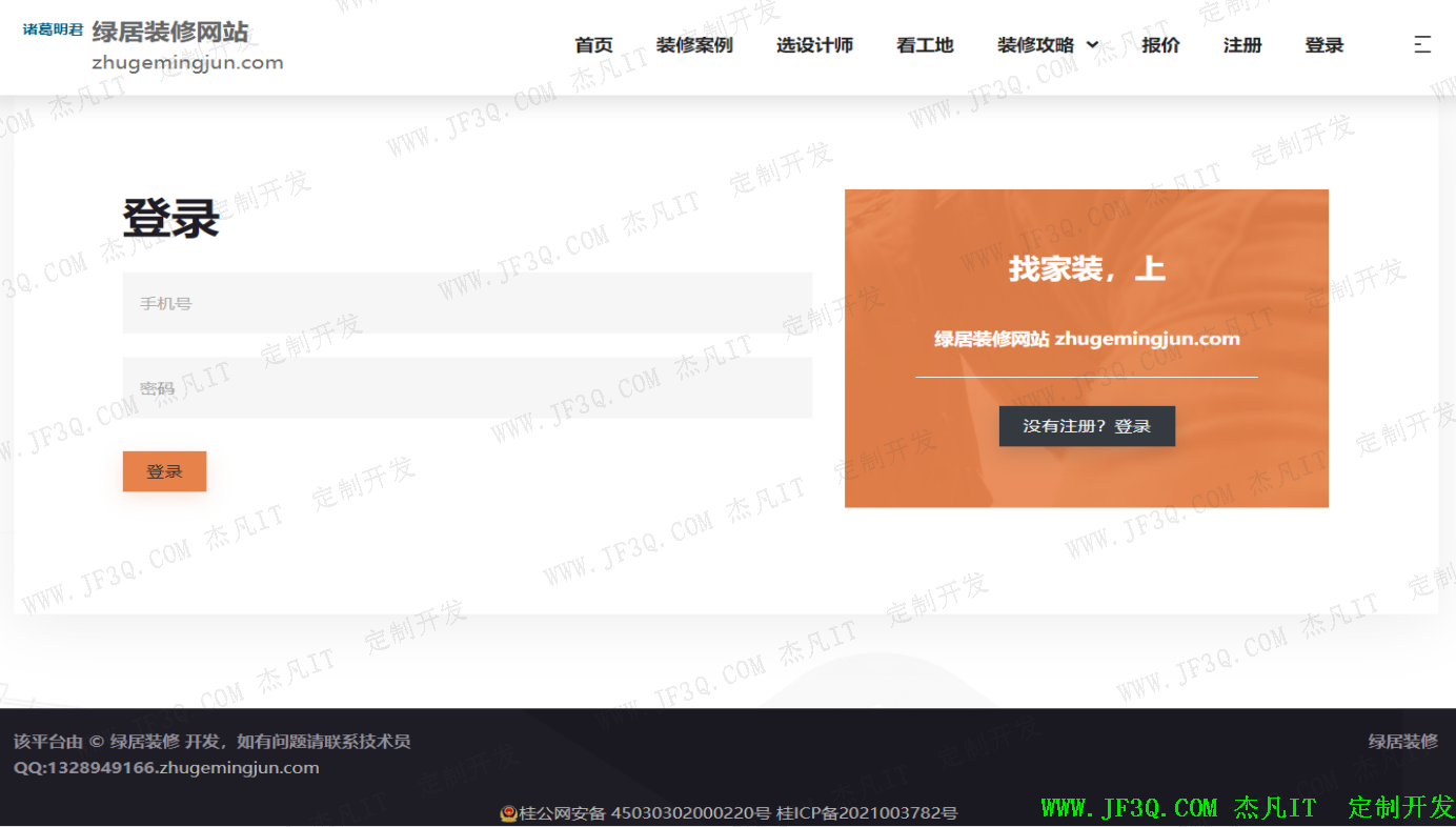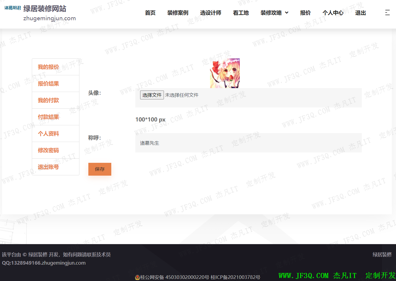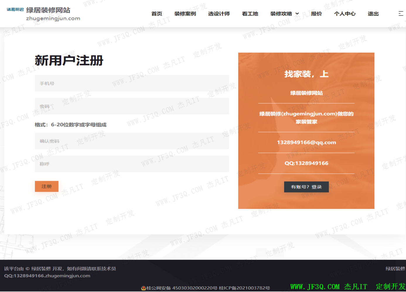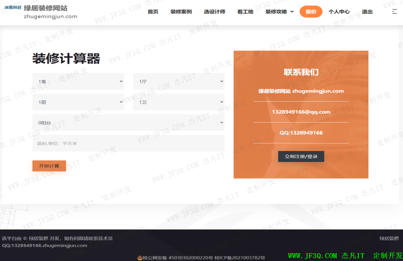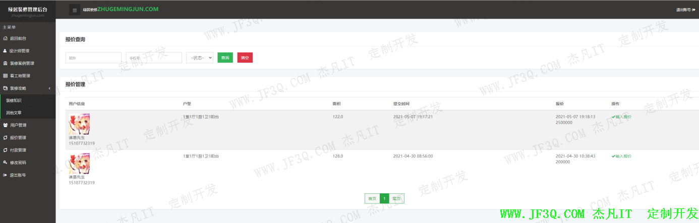 用户模块在绿局装修网站首页的导航栏中占据三个导航栏位置,分别是报价、注册、登录。用户注册后可以进行登录操作,用户登录后可以进行报价,或者进入用户界面,用户界面显示用户的报价信息、付款信息、个人资料、修改密码、退出账号等操作。如图5-7报价界面,如图5-8注册界面,如图5-9登录界面,如图5-10用户界面。