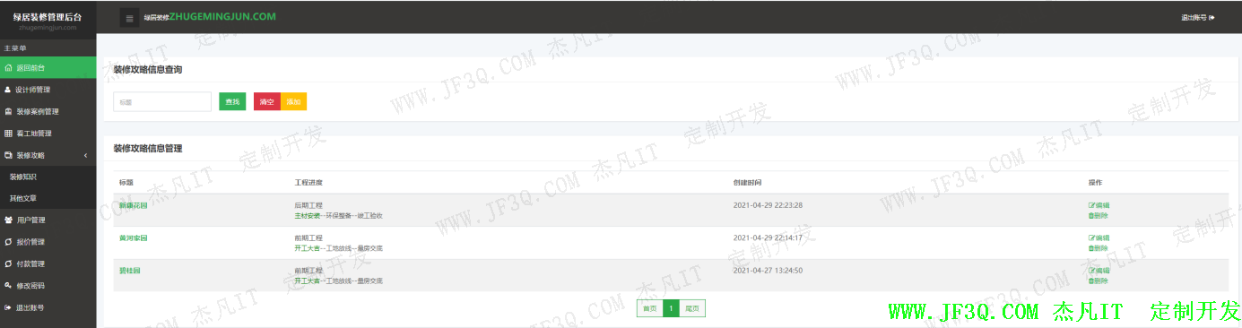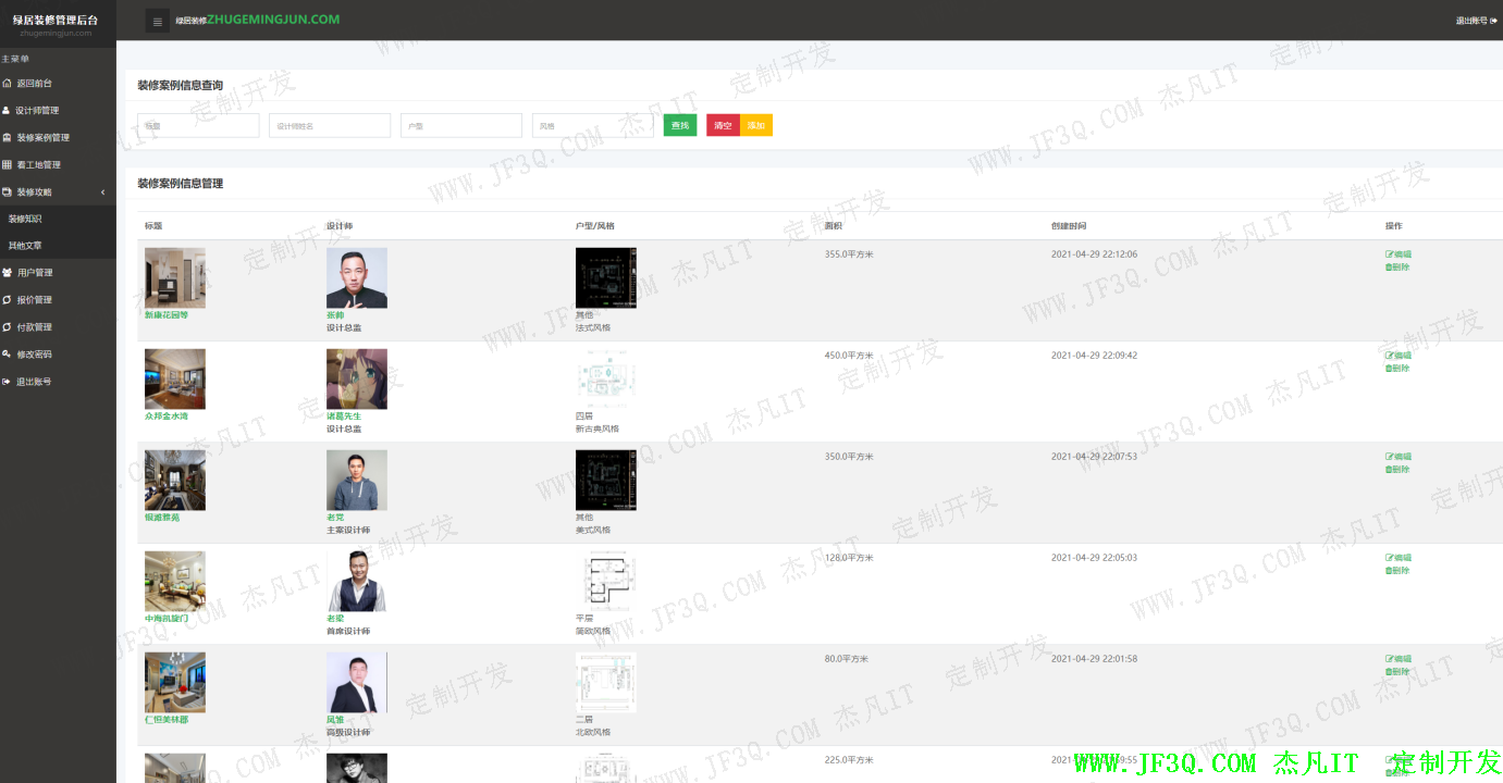 管理员可以通过装修案例管理模块对装修案例进行所有查询或条件查询,也可以对装修案例进行添加、编辑、删除。如图5-12装修案例模块。