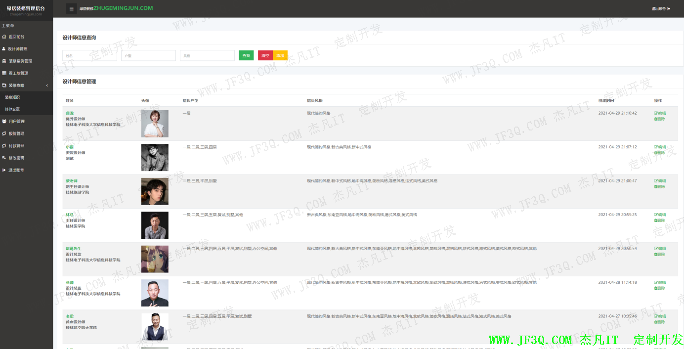 管理员可以通过设计师管理模块对设计师进行条件查询,也可以对设计师进行增删改查的维护操作。如图5-13设计师模块。