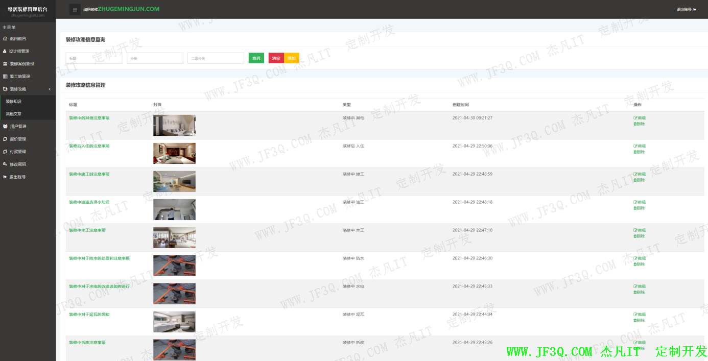 管理员可以通过装修攻略管理模块对装修攻略进行所有查询或条件查询,也可以对装修攻略进行添加、编辑、删除。如图5-15装修攻略模块。