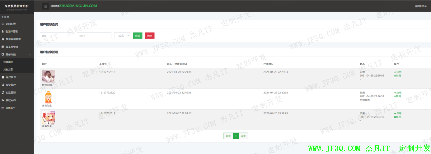 管理员可以通过用户管理模块对用户进行所有查询或条件查询,也可以对用户启用或者禁用操作,如果进行禁用,要输入禁用原因和禁用日期。如图5-16用户管理模块。