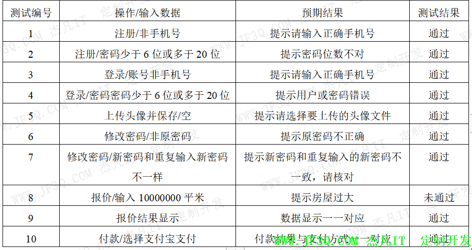 用户模块是服务于用户权限功能模块,其中有用户登录、注册、上传头像、修改密码、报价、报价结果显示、付款、付款结果显示等功能,通过测试结果和预期的测试用例结果进行比较,能够发现系统中可能存在的错误。表6-2用户模块功能的测试用例。