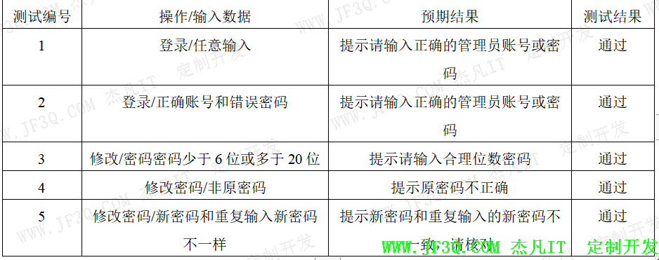 管理员模块是是服务于管理员的权限功能模块,其中有管理员登录、修改密码功能,通过测试结果和预期的测试用例结果进行比较,能够发现系统中可能存在的错误。表6-3管理员模块功能的测试用例。
