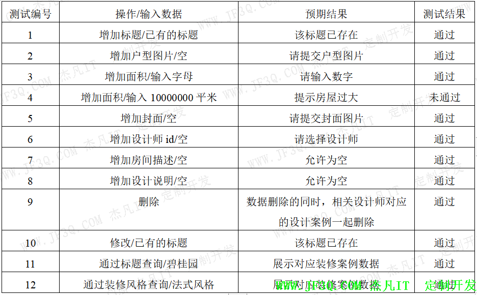 装修案例模块是对管理员开放的权限功能模块,包括装修案例的创建时间、标题、装修风格、装修类型、户型图片、面积、封面、设计师id、房间描述、设计说明进行增加,删除,修改,查询等操作,通过测试结果和预期的测试用例结果进行比较,能够发现系统中可能存在的错误。表6-4装修案例模块的测试用例。