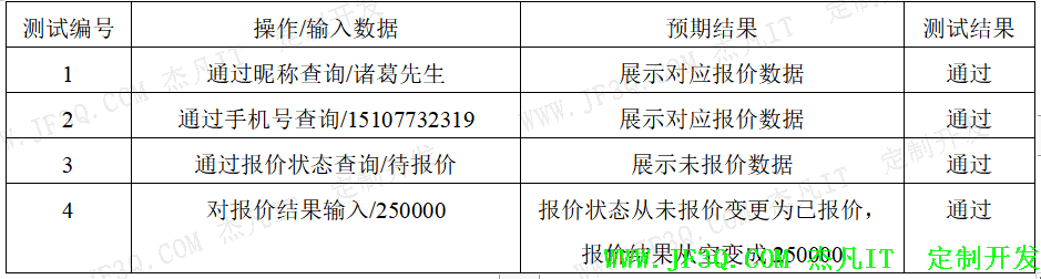 报价模块是服务于用户的的权限功能模块,管理员可以对其查询报价信息、对报价的结果输入功能,通过测试结果和预期的测试用例结果进行比较,能够发现系统中可能存在的错误。表6-5报价模块功能的测试用例。