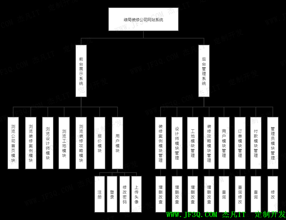 绿局装修网站系统分为两个子系统:前台展示系统和后台管理系统,其功能如图4-1网站层次概况图。
