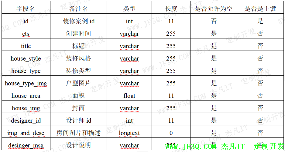 装修案例表(Case):存放装修案例的基本信息。见表4-3装修案例表(Case)。