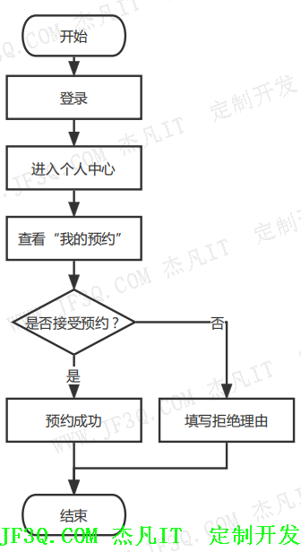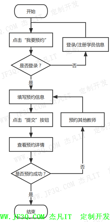 约,在一定程度上规范了预约流程,减少了无效预约。学员预约功能流程图如图4.8所示,学员点击预约按钮,填写预约信息后即可预约心仪的教员。学员可在自己的个人中心查看预约详情,比如预约状态,若教员拒绝预约申请则代表预约失败,学生可重新筛选心仪教师再次发出预约申请,反之则预约成功,教员和学员双方需按照约定时间进行试讲。