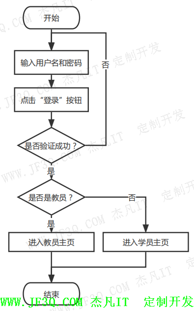 本系统的前台部分页面,如首页、公告页面、广告页面等,所有用户包括未登录的游客均可访问,但学员和教员的个人主页只有用户登录后才能访问,拦截了游客访问,具有一定保密性。用户登录后根据其注册性质进入学员或教员界面,登录流程图如图4.7所示,用户进入登陆页面后先进行用户名和密码的输入,通过验证后才能进入个人主页。