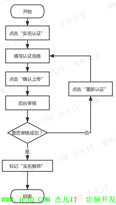 本系统为保证教员信息的真实性,特开设实名认证功能,在一定程度上防止了教员身份造假。实名认证的功能流程图如图4.10所示,教员进入个人中心进行实名信息填写后,后台管理员可查看实名详情,可根据上传图片的真实性选择通过认证与否。