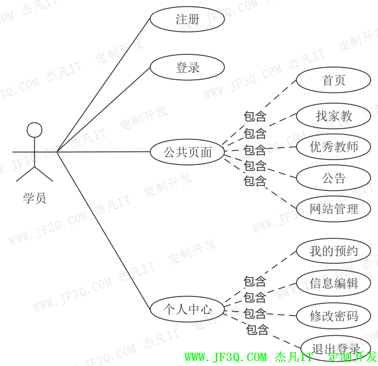 家长注册成功后,根据提示信息选择成为学员用户并填写学生的相关信息。登录后进入学员个人中心,可进行个人信息编辑、预约详情查看、修改密码以及退出登陆等功能。学员用例如图3.2所示。