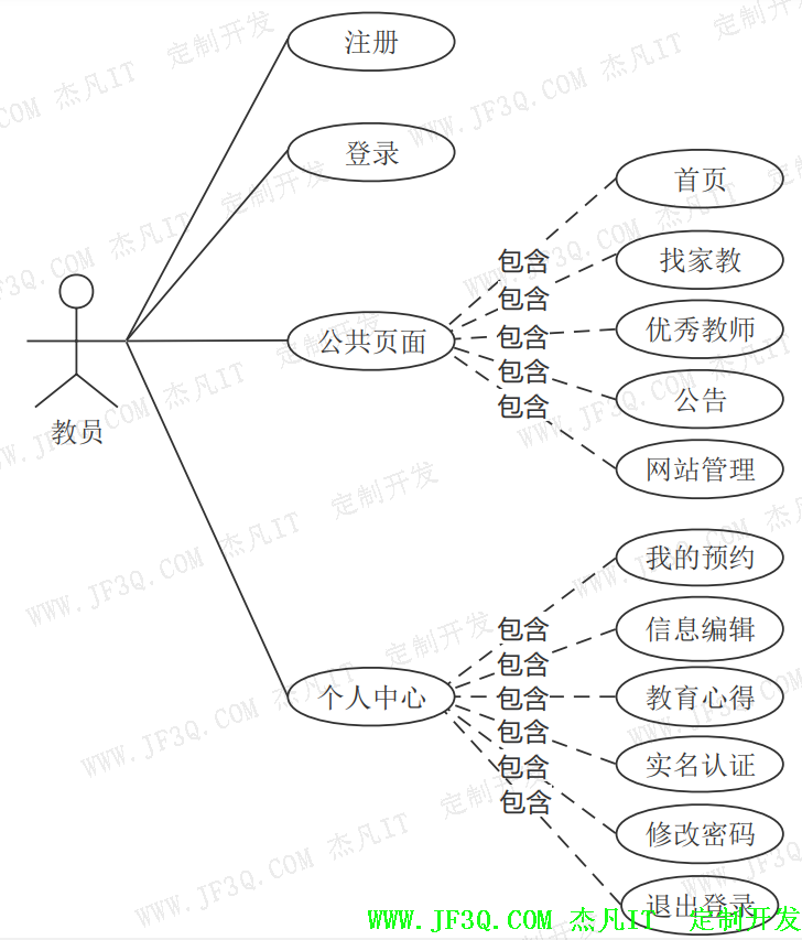 家教老师注册成功后,根据提示信息选择成为教员用户并填写个人信息。登录后进入教员个人中心,可进行个人信息编辑、预约详情查看、教育心得填写、实名认证、修改密码以及退出登陆等功能。教员用例如图3.3所示。