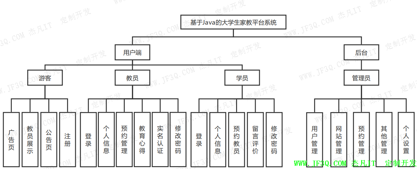 近年来,越来越多的家长选择上门一对一家教,同时许多大学生也愿意利用课余时间通过做家教的方式赚取零花钱。但是家长和家教老师之间存在一定的信息壁垒且通过线下家教机构获取家教信息效率较低,因此越来越多的家长和家教老师都发现需要一套现代化的线上家教平台来帮助彼此提高效率,该平台可帮助家长发布家教信息、筛选合适的老师以及帮助家教老师获取有效的家教招聘信息。本大学生家教平台就是根据这些因素来设计和开发的。通过对线上家教平台的需求分析,本大学生家教平台主要实现功能结构图如下图3.4所示。