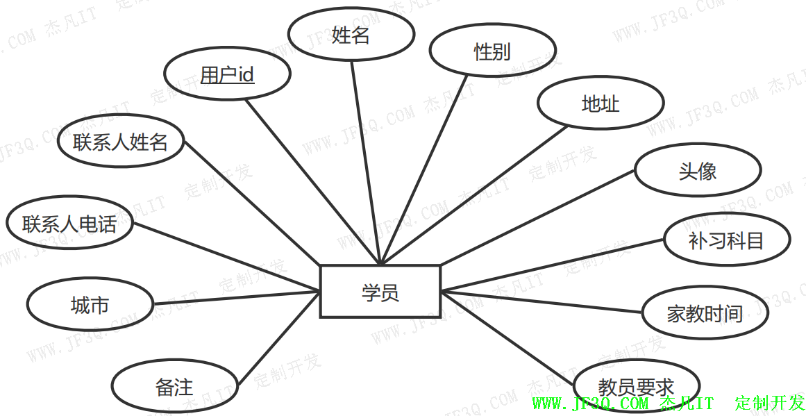 (%1) 学员实体E-R图如图4.2所示,主键是用户id编号,其他还有姓名,性别,地址,补习科目,补习时间,联系人姓名、电话等属性。