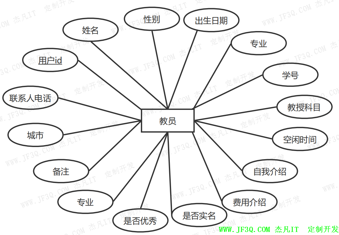 (%1) 教员实体E-R图如图4.3所示,主键是用户id编号,其他还有教员姓名,性别,出生日期,专业,教授科目,空闲时间,联系电话等属性。