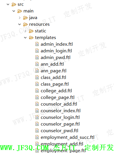 大学生就业信息管理系统的整体结构框架是依照软件工程的基本原则进行开发,系统以Eclipse平台作为开发环境,采用Spring boot框架技术,选择MySQL关系型数据库,实现后台数据的存储与管理,前端开发技术利用Web应用开发中的组件Freemarker,运用B/S架构实现数据交互来完成系统开发。