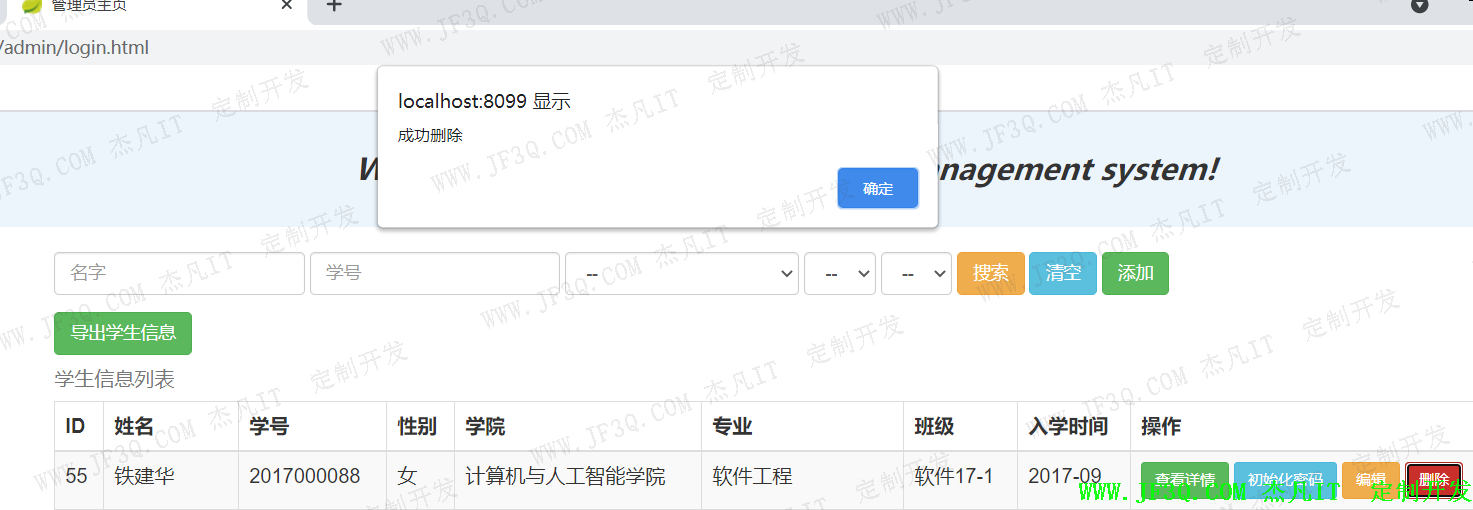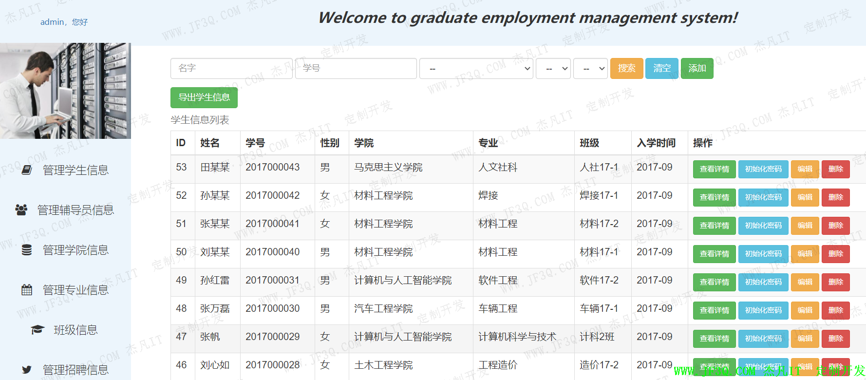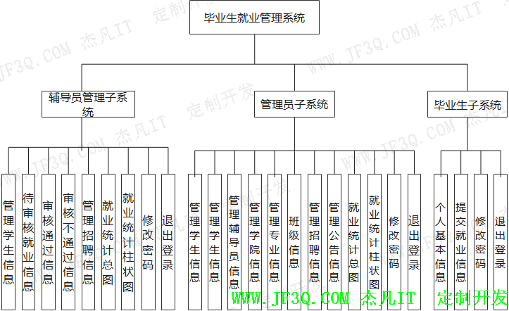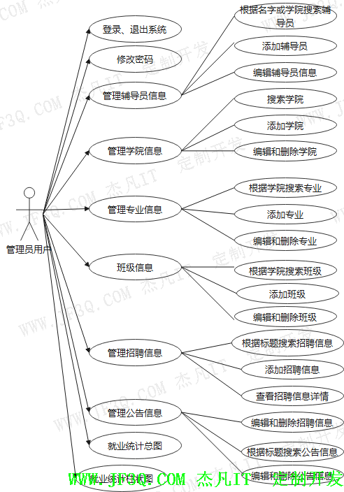 管理员子系统主要包括管理学生信息、管理辅导员信息、管理学院信息、管理专业信息、班级信息、管理招聘信息、管理公告信息、就业统计总图、就业统计柱状图、修改密码和退出登录等功能。在所罗列的基本功能上有相应的增删改查等操作。