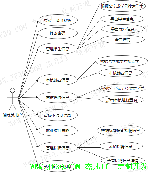 辅导员子系统主要包括管理学生信息,这里所管理的学生只包括辅导员所在学院的学生信息、待审核就业信息、审核通过信息、审核不通过信息、管理招聘信息、就业统计总图、就业统计柱状图、修改密码以及退出登录等操作。在审核就业信息过程中,给予审核通过或不通过的原因和说明。