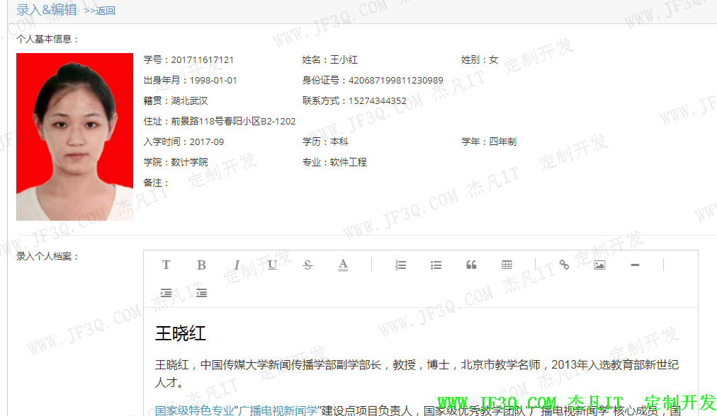 主要实现对学生档案的录入,存档,和修改,可以根据姓名和学号检索数据库,方便快速的查询定位,利用超文本编辑框simditor-1.0.5插件编辑学生档案信息,可输入表格,图片,文字等多类型的文本,灵活方便。部分实现效果图如下: