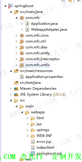 com.mfc.cons系统常量,主要是统一同系的一些设定,比如分页,上传图片的总路径和分路径,启用禁用的常亮等;com.mfc.ctrl是controller控制层,处理前端提交过来的post和get请求;com.mfc.dao处理数据的增删改查;com.mfc.entity实体封装;com.mfc.Interceptor登录拦截器;com.mfc.untils工具包,比如图片上传和删除,日期转换等。