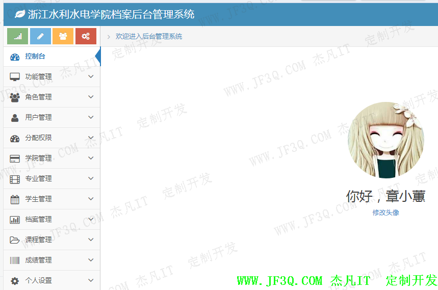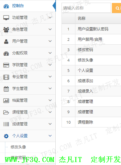 可以根据职责划分,超级管理拥有所有的权限;二级管理员拥有学院专业,分配教师授课,学生档案管理权限;任课教师拥有成绩管理的权限(也可以在此细化)。可以将角色分配给用户,这样用户在登录时候就会拥有自己的对应权限的菜单了。 部分实现效果图如下: