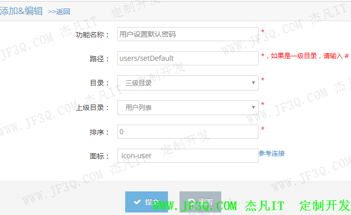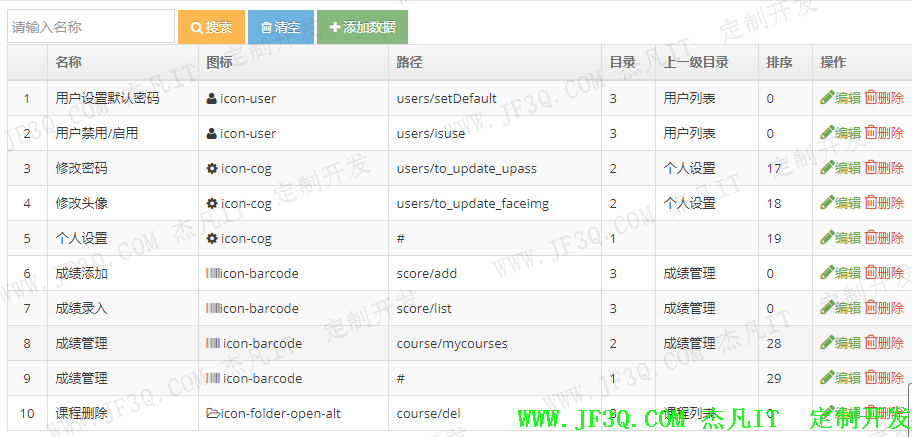 包含系统所有功能的action路径,比如添加,查看,修改,删除,禁用,启用,设置默认密码等action。主要实现对功能的查询,分页,添加,编辑,修改,按功能名称筛选查询功能。功能目录分为一级目录(主菜单),二级目录(主菜单下的二级菜单),三级目录级(二级菜单里的具体功能,比如添加,修改,查看,筛选,删除等),还可以根据排序字段来进行排序来决定右边树形菜单的前后显示顺序。部分实现效果图如下: